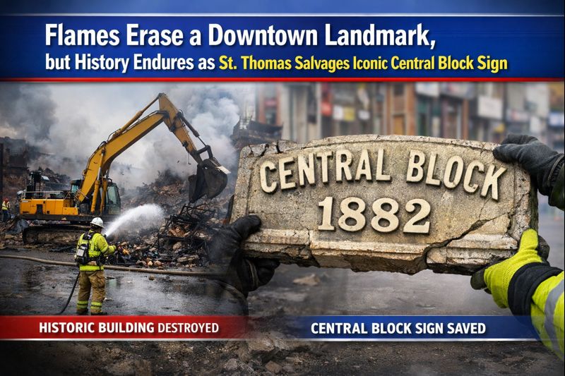A prominent piece of downtown St. Thomas history has been reduced to rubble after a devastating fire tore through a historic building on Talbot Street, forcing its demolition and displacing residents and businesses. While the structure itself could not be saved, city officials and crews were able to preserve one important artifact — the iconic “Central Block 1882” sign — offering a symbolic link to the city’s past amid the destruction.